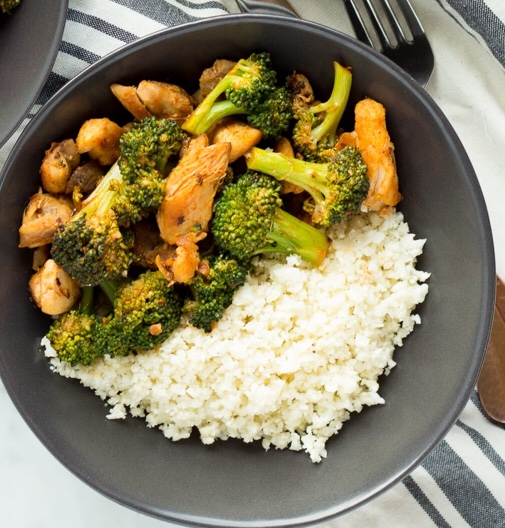 This Buffalo Chicken and Broccoli Bowl is fast, easy and flavorful. Chicken and broccoli in a buffalo sauce, served over cauliflower rice makes a gluten-free, low carb, high protein, paleo and whole 30 friendly meal! Foxandbrier.com