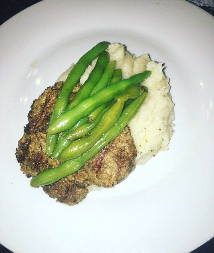 Talk about tasty this salad is made with mixed greens, ground turkey, dill pickles, tomato’s and topped with fat free thousand island dressing , dairy free mozzarella cheese and poppy seeds.