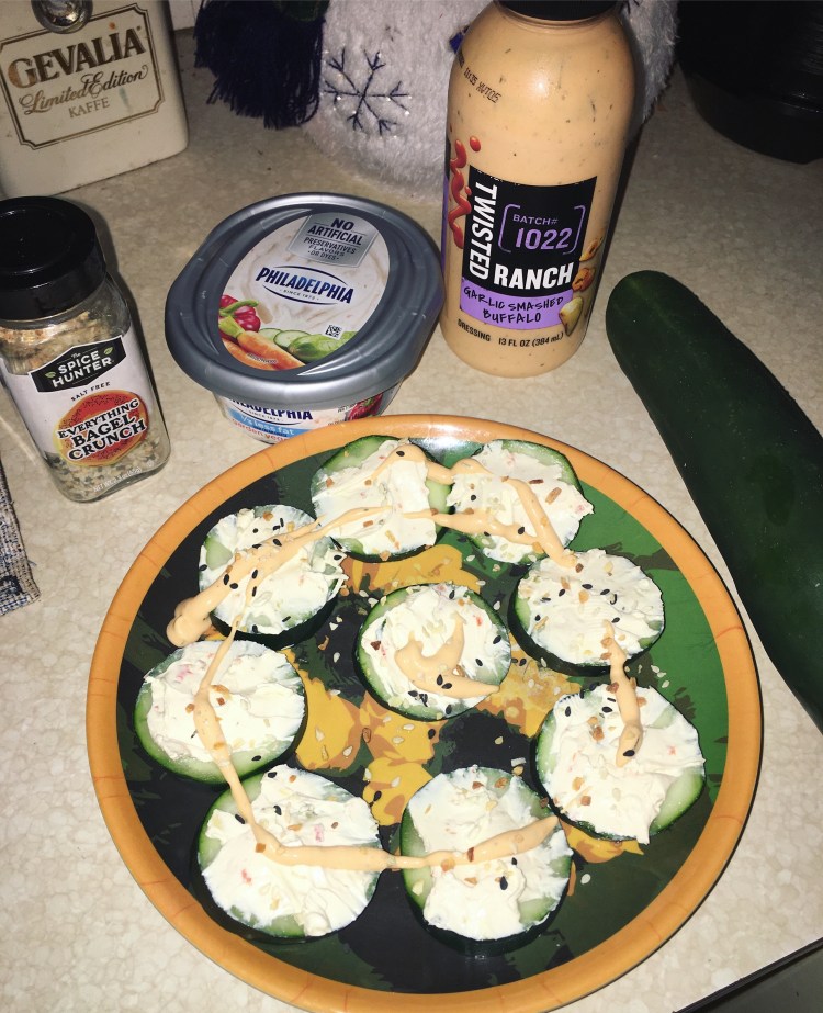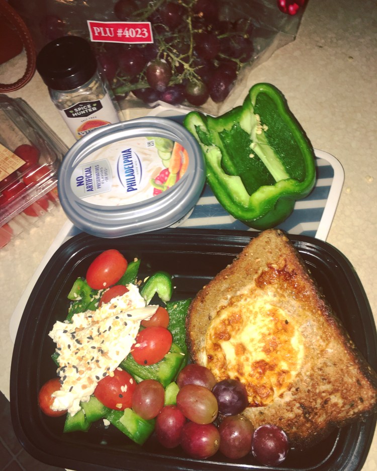 If you are not a fan of salads these egg in the baskets paired with fresh fruit and veggies topped with cream cheese and everything but the bagel seasoning are to die for.