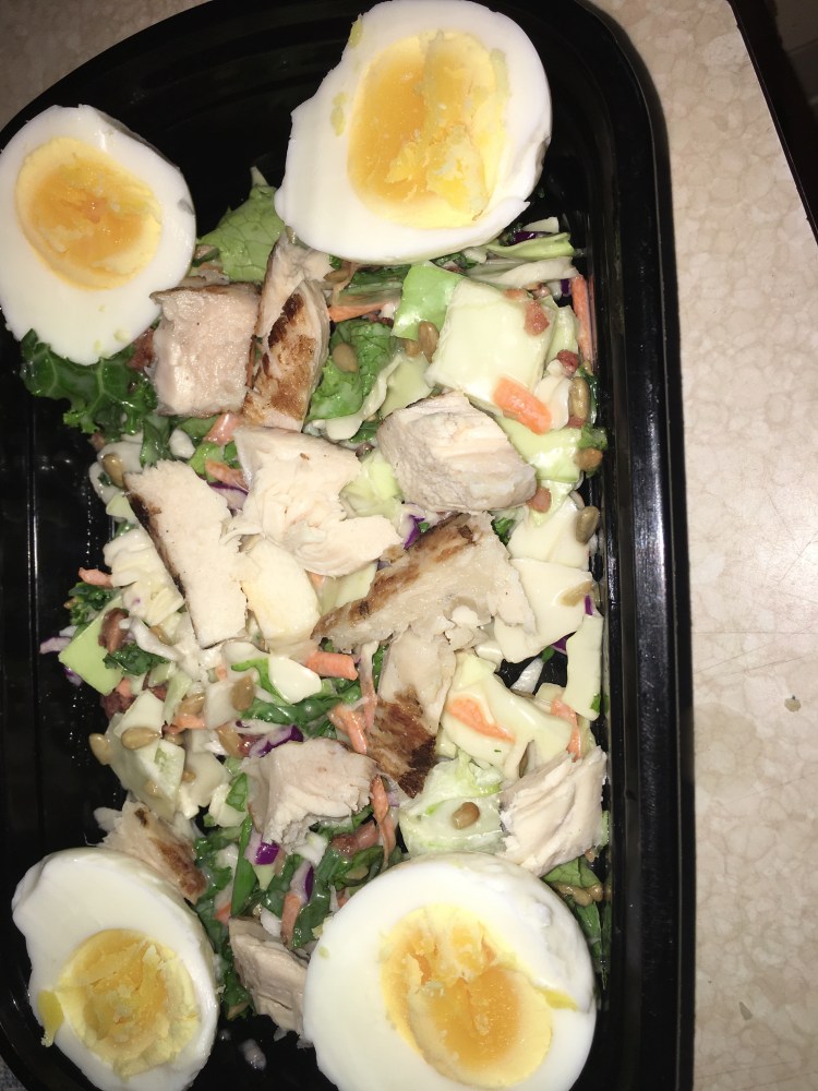 I love these Sunflower salad packs, you can get them from Ingles with the dressing and everything then just add what ever topping you like. I add boiled eggs and Chicken Brest strips to make it filling.