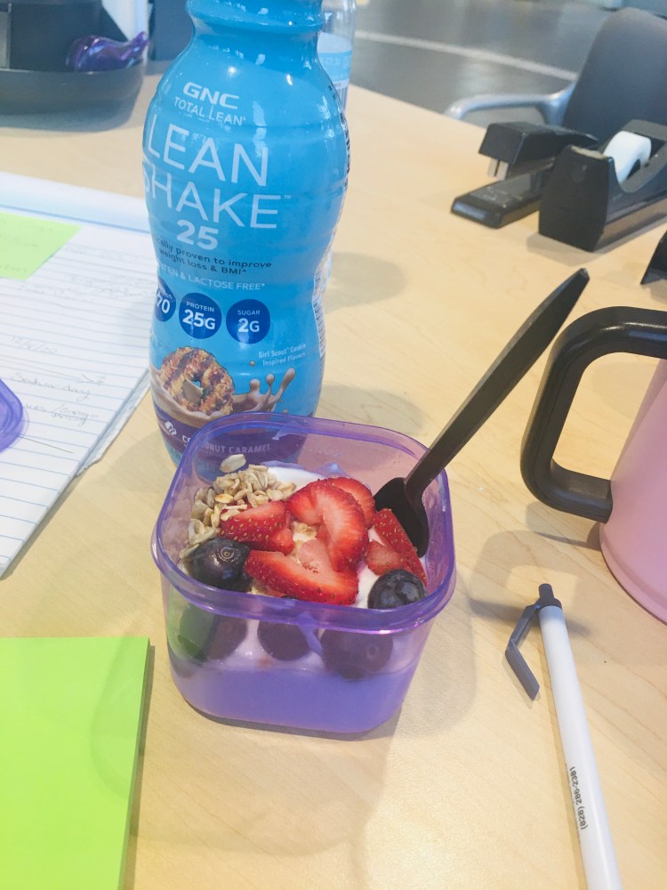 Breakfast is usually on the go so I try to stick with something I can take with me like a smoothie or over night oats which are my favorite right now. I eat once i get to work around 8 am. Here are some of my go to breakfast items.